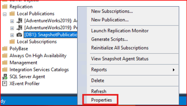 Set edeceğiniz kullanıcıyı PAL’a üye yapmak için Publisher’ın olduğu instance’ta publication’a gelip sağ tıklayarak properties diyoruz.