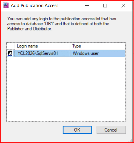 Uyarıda, kullanıcının burada listelenmesi için Publisher ve Distributor instance’ında tanımlı olmasına ve replike edeceğimiz DB1 veritabanına erişiminin olması gerektiğini söylüyor. Eğer kullanıcınız burada yoksa publisher ve distributor’un olduğu instance üzerinde kullanıcınızı tanımlayıp DB1 üzerinde de yetkilendirmeniz gerekir.