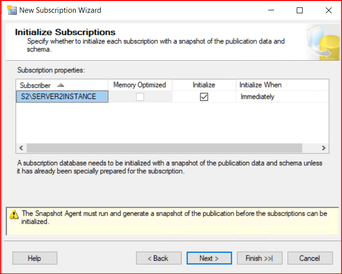 Bir sonraki ekranda, subscriber’a(asıl veritabanını replike edeceğimiz veritabanı,yani 2.instance’daki DB1) hemen verileri aktarmak için Immediately’yi seçerek next diyoruz.