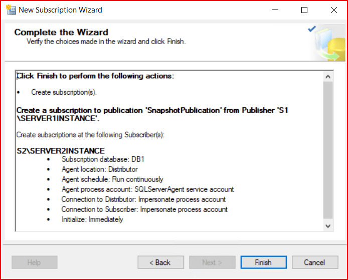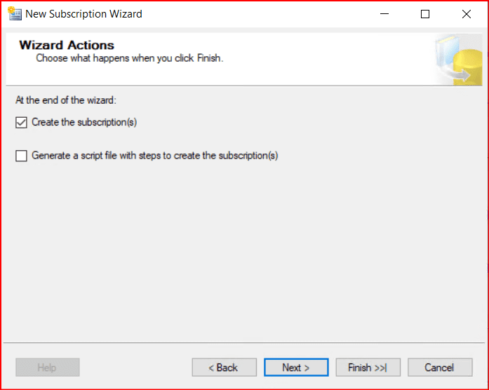 Bir sonraki ekranda aşağıdaki gibi Create the subscription(s) seçili haldeyken next diyoruz ve Finish diyerek işlemi tamamlıyoruz.