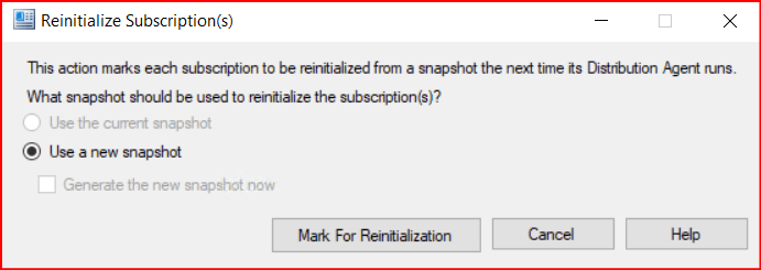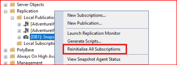 Herhangi bir zaman da manual olarak snapshot’ın çalışmasını istiyorsanız SSMS üzerinden aşağıdaki gibi SnapshotPublication’a sağ tıklayarak Reinitialize All Subscriptions diyebilirsiniz.