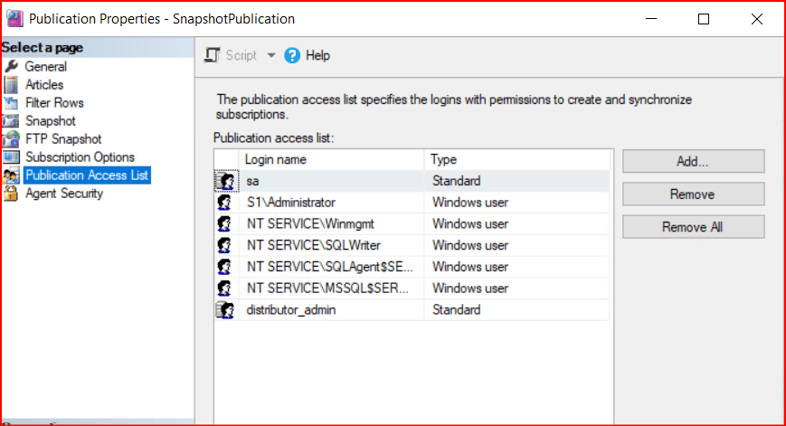 Açılan ekranda aşağıdaki gibi Publication Access List’e giderek listelenen kullanıcılar arasında kendi kullanıcımızın olup olmadığına bakıyoruz.