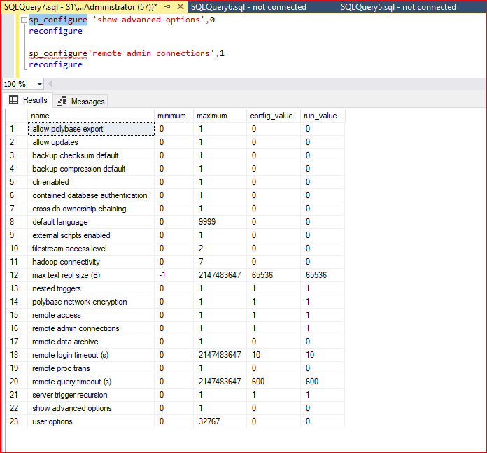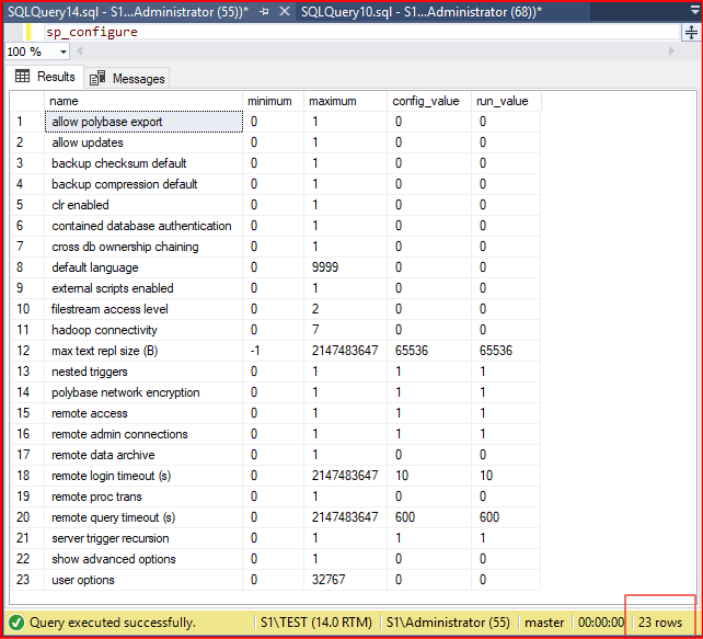Normalde sp_configure komutunu çalıştırdıktan sonra 23 tane tool geldi sizde sayısı farklı olabilir.