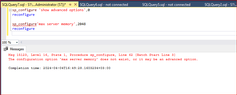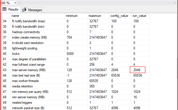 Kısacası hata almamızın sebebi Show advanced options’ın açık olmaması. Şimdi show advanced options enable yapıyorum tekrar çalıştıralım bakalım max server memory değeri gelecek mi?