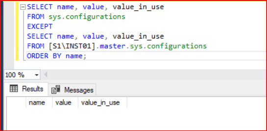 sp_configure ayarları başka bir sunucu ile aynı yapılacaksa iki sunucu arasında linked server yapısı oluşturulur. Aşağıdaki komut çalıştırıldığında ikinci sunucuda olmayan tüm sp_configure ayarları görülmektedir.