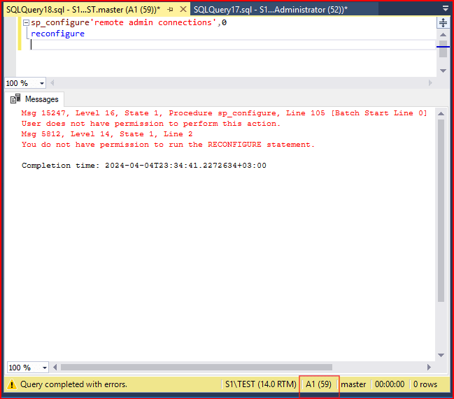Herhangi bir kullanıcı sa’ın yapmış olduğu ayarları görür ama sa yetkisi olmayan herhangi bir kullanıcı değişikliğe izin vermiyor bunun için kullanıcı bazında bazı ayarların yapılması gerekiyor. A1 kullanıcısına instance üzerinde yetki verildiği zaman sp_configure ayarlarını değiştirebilecek.