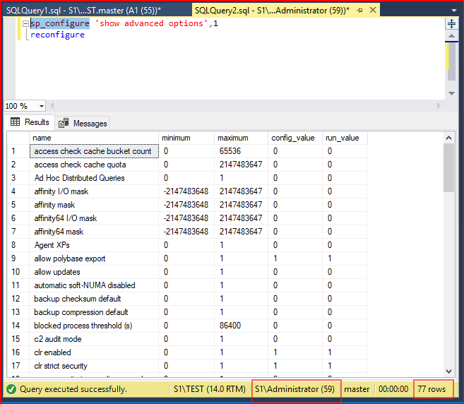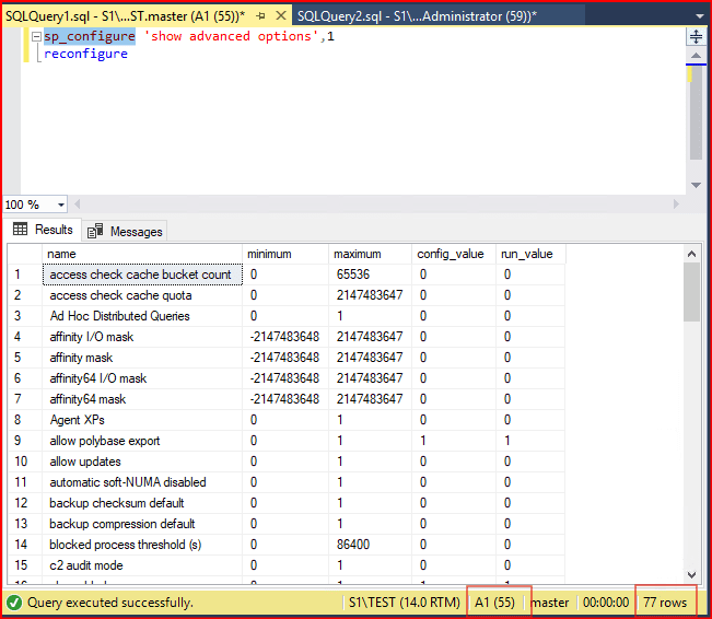 Bazı ayarlar sunucunun yeniden başlatılmasını veya RECONFIGURE WITH OVERRIDE kullanılmasını gerektirebilir. Ve çoğu zaman önce show advanced options ayarını açman gerekir. RECONFIGURE ile set edilen değeri çalışan değer olarak yapıyoruz.
