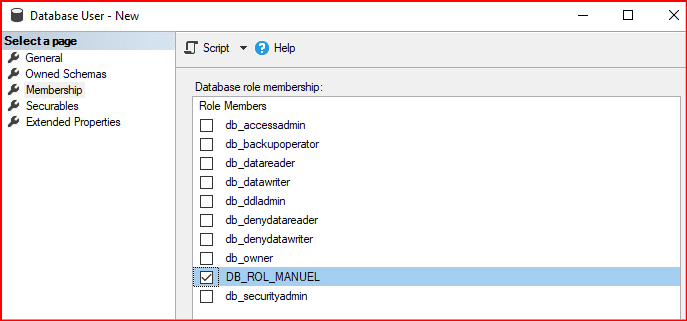 Database nesnesini seçip bu role ün hangi database üzerinde yetkisini olmak istiyorsak onu seçiyoruz.