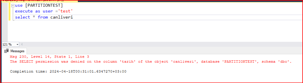 Şimdi bu user ile bağlandıktan sonra select çekelim tarih kolonumuza izin vermemiştik deny demiştik.