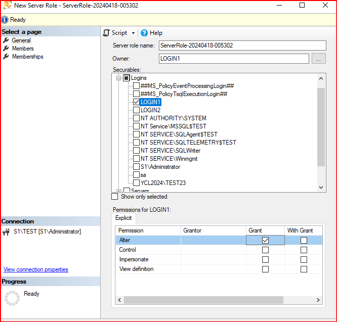 S1\TEST instance altında Security bölümünde New Server Role.. kısmında adımlarıma başlıyorum.