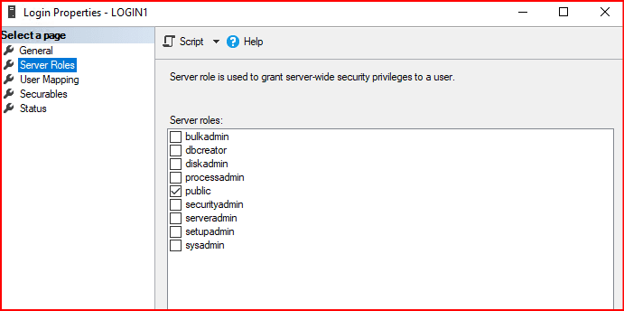 Normalde login’lerin server role’ü public. public rolü, tüm loginlerin temel seviyede sunucuya erişebilmesini sağlamak için varsayılan olarak atanır. public rolünün üyeliği değiştirilemez, yani bir kullanıcı bu rolden çıkarılamaz.