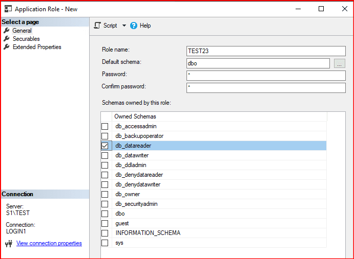 CREATE APPLICATION ROLE [TEST23] WITH DEFAULT_SCHEMA = [dbo], PASSWORD = N'1'
