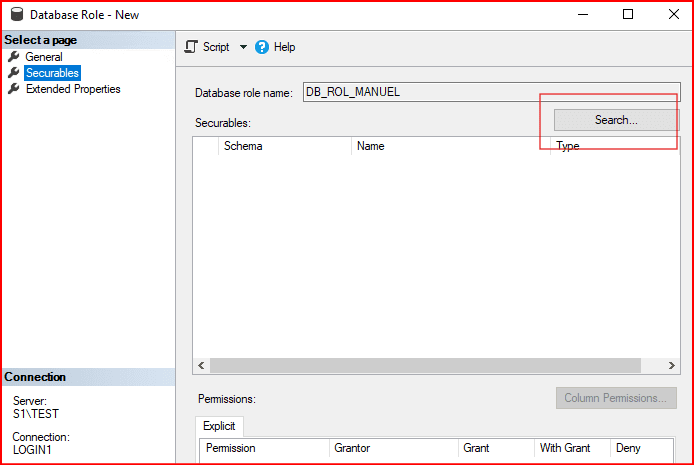 New database securables kısmından yapabileceğimiz gibi role oluşturduktan sonra veritabanı sağ tıklayıp properties kısmından permissions sekmesinden search kısmından ilgili database role’ü seçebiliriz.