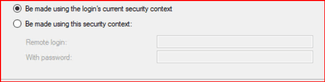 SQL Server, o an SQL Server’a bağlanmış olan kullanıcının kimlik bilgilerini (kullanıcı adı ve şifre) uzak sunucuya iletmek için kullanır. Kısacası Local login bilgileri ile uzakta olan sunucuya giriş yapmak için kullanılır. Örneğin eğer local sunucuda Windows Authentication seçeneği kullanılıyorsa uzak sunucuda da Windows Authentication seçeneğinde kullanılan bilgilerle giriş yapmayı deneyecektir.