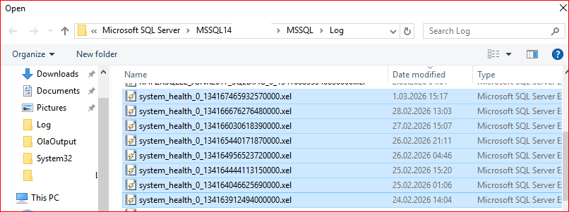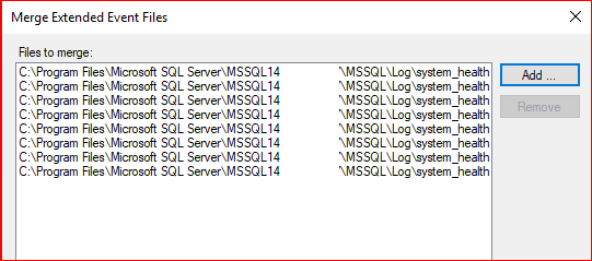 Gelen ekranda Add.. denilip sql server log klasörü altında bulunan tüm .xel uzantılı dosyalar seçilip genel bir okuma işlemi yapılır.