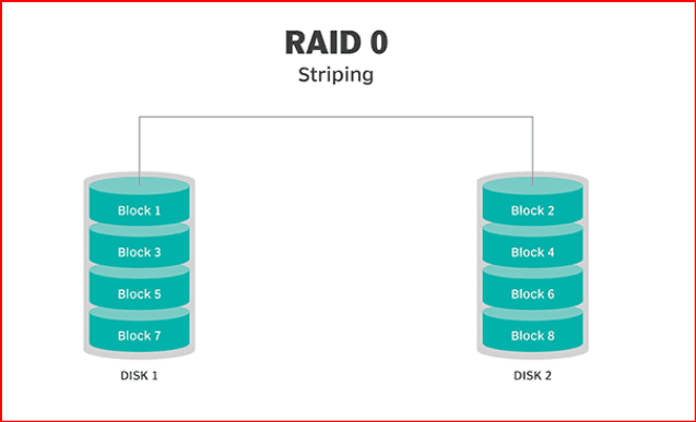 RAID 0’ı uygulamak için en az iki diske ihtiyaç vardır. 32 diske kadar kadar çıkılabilir. Veri, veri gövdesini bloklara bölerek ve bunları birden fazla depolama aygıtına dağıtarak, yedeklilik için herhangi bir parite bilgisi olmaksızın iki veya daha fazla diske eşit şekilde bölünür. Verileri sırayla birkaç sürücüye yazar ve birden fazla sürücüye paralel erişime izin vererek okuma performansı oldukça artırır.