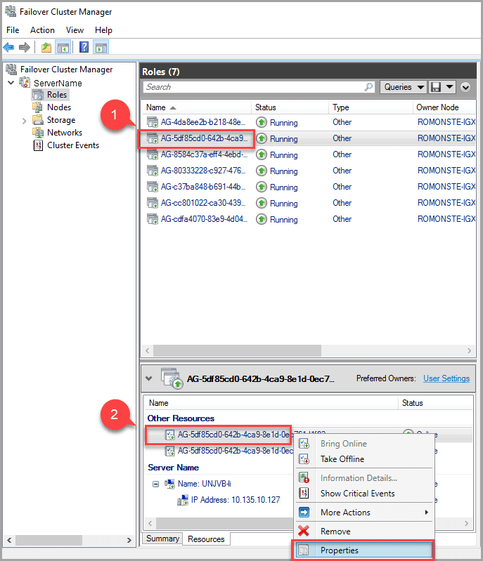 Failover cluster ekranından resimlerdeki belirtilen yerde bulunabilir. Hangi AG role üzerinde bu işlem yapılması isteniyorsa ilgili AG yapısı seçilmektedir.