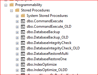 Biz tüm procedure’lerimizin güncellenmesi için MaintenanceSolution.sql scriptini indirip mevcutta bulunan stored procedure yapılarının ismini değiştiriyoruz. Oluşturulan procedure hangi veritabanı altında oluşturulmuşsa ilgili veritabanı Programmability kısmından görülebilir.