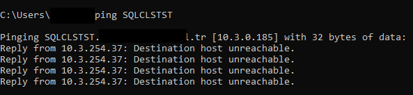 Powershell üzerinden tekrardan nslookup çekildiğinde iki ip değerimizin görüldüğü ilk ip değerinin sıralamada öncelikle olması son kullanıcının Offline olan ip adresine bağlanmasına sebep olacaktır. Kullanıcının Connection String’inde MultiSubNetFailover olmaması 10.202.0.56 ip bloğunun denenmemesine sebep olacaktır. Sadece ilk ip adresi alınır. İster aktif olsun ister pasif olsun. Son kullanıcının sorunsuz bağlanması için Connection String’inde MultiSubNetFailover= True yapılması aşağıdaki resimde görülen iki ip değerine sırasıyla bağlanmasına sebep olacaktır. Hangisi Online ise ona bağlanır.