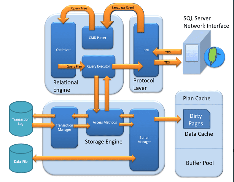 Aşağıdaki resim daha detaylı bir sql server mimarisi olarak karşımıza çıkmaktadır. Açıklamalarımızı ilk resim üzerine yapmış olacağız.