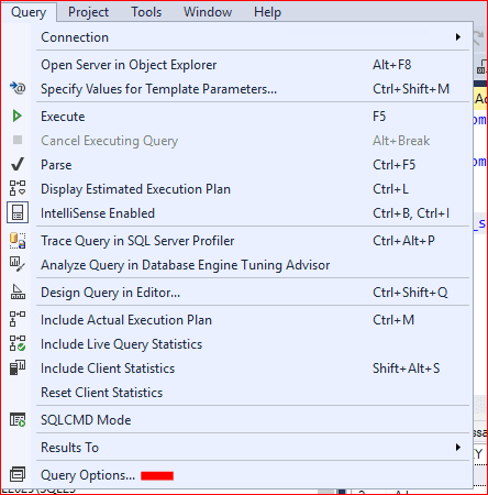 İkinci olarak bu ekranı açacağımız bölüm SSMS arayüzünde Query bölümünde bulunan Query Option kısmıdır.