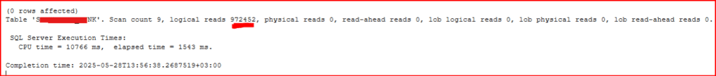 - Logical reads: Bellekten (cache’ten) okunan 8KB’lik sayfa sayısı (972,452 sayfa ≈ 7.6GB veri). Çok yüksek bir değer.