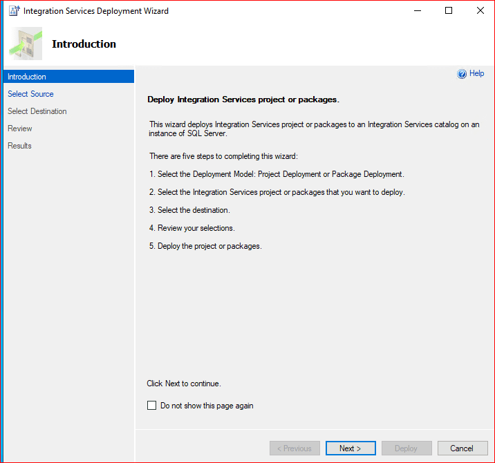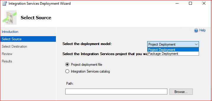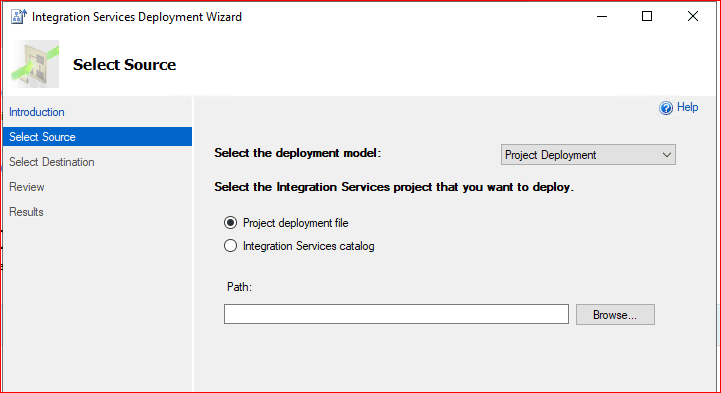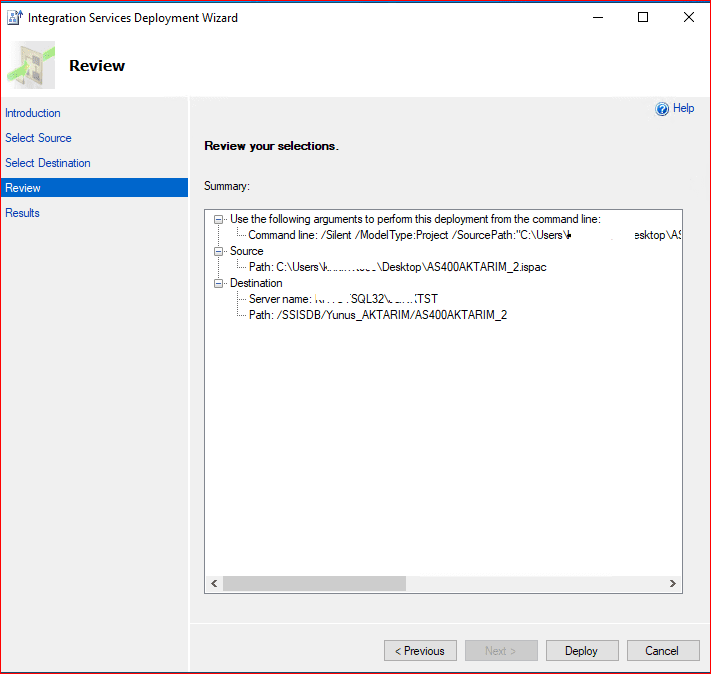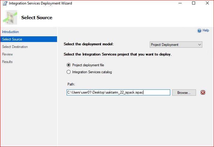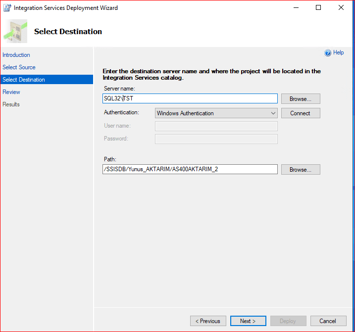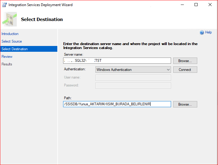 Integration Services catalog: Daha önce SSIS kataloğuna yüklenmiş bir projeyi seçmenizi sağlar. SQL Server’da zaten dağıtılmış bir projenin yeni versiyonunu dağıtmak istediğinizde seçilmesi gerekmektedir. Önceden Project deployment file ile eklenmiş bir ispac paketini bu yöntem ile seçip ismini değiştirip yeni bir proje gibi deploy edebiliriz.