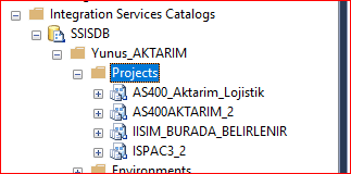 Aşağıdaki resimde SSISDB kök dizin bu kök dizin altında folder oluşturularak proje ekleme işlemi yapılır. Projelerin SSISDB altına eklenmesi önerilmez. Ayrıca ispac paketinin oluşturulacağı proje isminin AS400AKTARIM_2 olması gerektiğini yukarıda belirtiyoruz.
