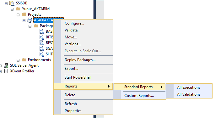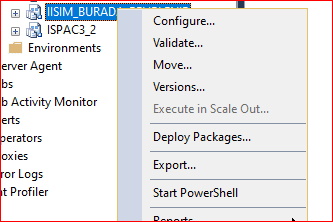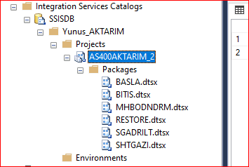 Sql server üzerinde SSISDB altında eklemiş olduğumuz ispac paketinin geldiğini görmüş oluyoruz.