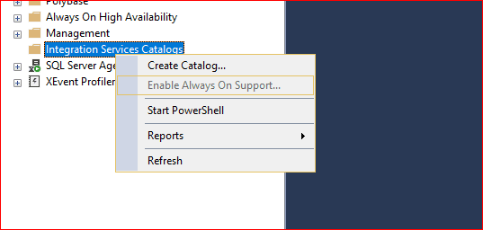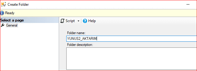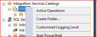 Yukarıdaki işlemin haricinde aşağıdaki resim gibi yeni bir klasör eklenmek istenirse SSISDB üzerine sağ tıklanıp Create Folder.. denilerek yeni bir folder eklenebilir.