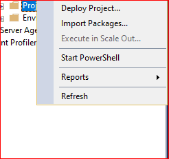 Öncelikle bir ispac paketi eklemek için SSISDB altında bir bir folder oluşturulur. Daha sonra oluşturulan folder kısmında project bölümüne tıklanır.