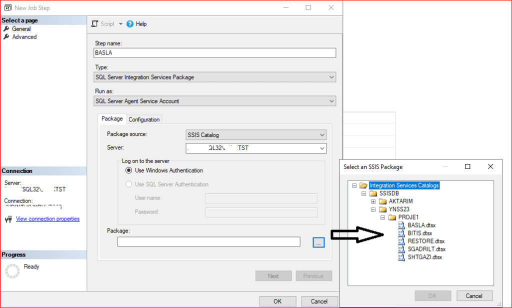 - Varolan bir projeyi güncelliyorsanız → Integration Services catalog seçin ve katalogdaki projeyi seçin