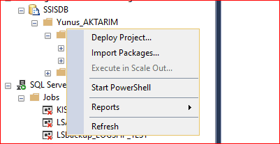 Oluşturulan SSISDB kataloğunun altında bulunan YUNUS_AKTARIM klasörü altında bulunan Project kısmına sağ tıklayıp Deploy Project.. denildikten sonra yeni bir ispac paketi eklenebilir.