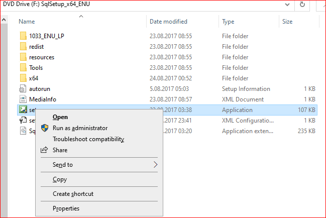 SSIS ekleyeceğim sunucum üzerine Sql Server setup dosyasına sağ tıklayıp Run as administrator olarak çalıştırıyorum.