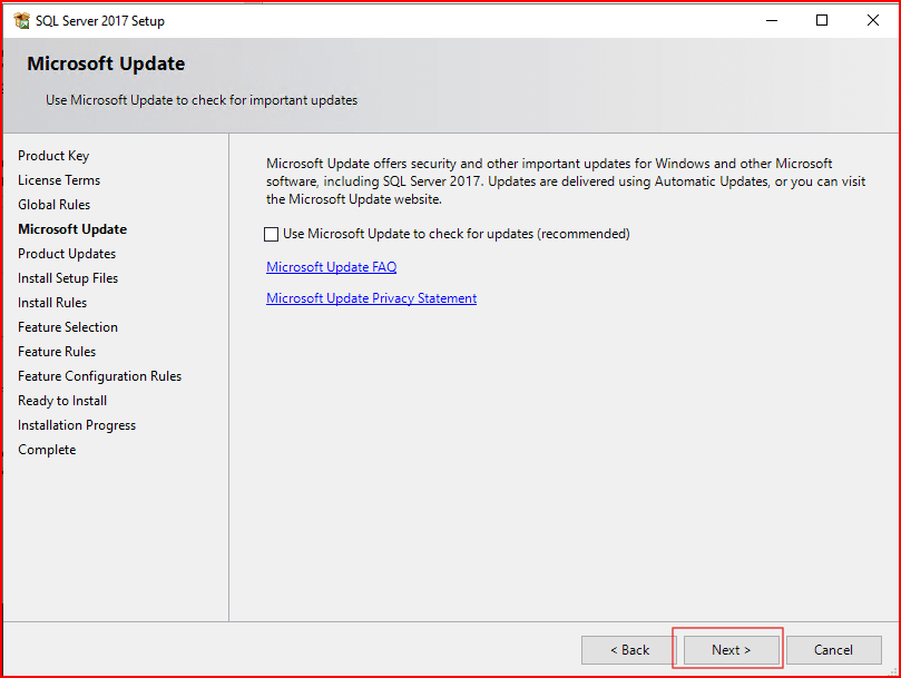 Bir sonraki ekranda Use Microsoft Update to check for updates seçeneğini seçmeyip Next deyip ilerliyorum.
