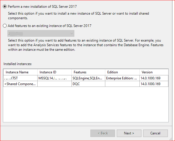 Next deyip bir sonraki ekrana geçtiğimizde yeni bir sql server instance kurulumu yapacağımız Perform a new installation of SQL Server 2017 seçeneğini seçebiliriz. Mevcut kurulu olan bir instance’a yeni bir özellik eklemek istediğimizde Add features to an existing of SQL Server 2017 seçeneğini seçiyoruz.
