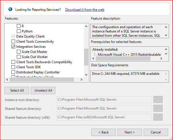 Gelen ekranda yeni gelen Features’ları seçiyorum. Resimde dikkat ederseniz önceden seçilmiş olan instance Features’lar buzlanmış bir şekilde gözükmektedir. Integration Services seçimini yaptıktan sonra Next deyip bir sonraki aşamaya geçiyorum.