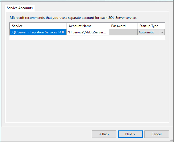 Gelen ekranda SQL Server Integration Services kısmında integration servisimizin çalışacağı bir servis hesabının seçilmesi gerekmektedir. Servis hesabı seçilmeyip default olan servis hesabının olmasında herhangi bir sakınca yoktur. Startup Type kısmı Automatic olarak ayarlanması gerekmektedir. İlgili ayarlamalardan sonra Next ile bir sonraki aşamaya geçilmesi gerekmektedir.