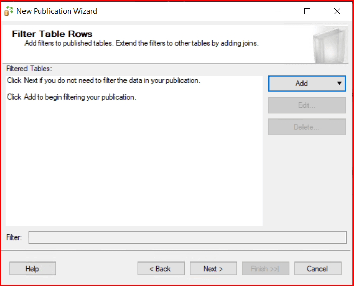 Bir sonraki ekranda bize tablonun tamamını değil de belli bir filtreye göre filtrelenmiş halini aktarmak istersek bu kolaylığı sağlayan ekran geliyor. Aşağıdaki ekrandan Add diyerek istediğimiz filtreyi ekleyip tablonun belli bir kısmını replike edebiliriz. Biz şu anda herhangi bir filtreleme yapmadan next diyerek ilerliyoruz.