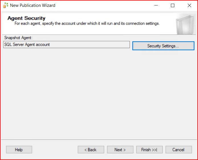 Bir sonraki ekranda Snapshot Agent ve Log Reader Agent’ın kullanacağı kullanıcı hesaplarını soruyor. Security Settings’e tıklayarak ilgili kullanıcıları set edebiliriz.