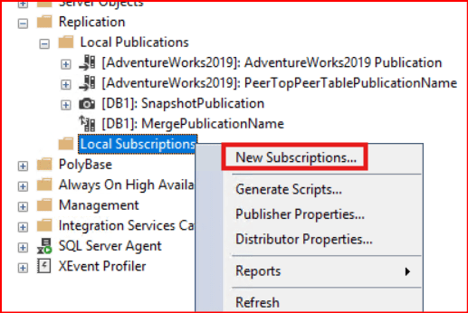 Publication’ı tanımladıktan sonra 1.instance üzerinde aşağıdaki gibi New Subscriptions diyoruz.