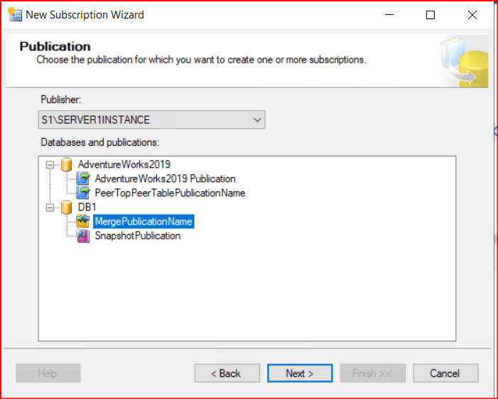 Gelen ekranda aşağıdaki gibi Publisher kısmından Publisher’ı tanımladığımız instance’ı seçiyoruz ve oluşturduğumuz MergePublication’ı seçerek next diyoruz.