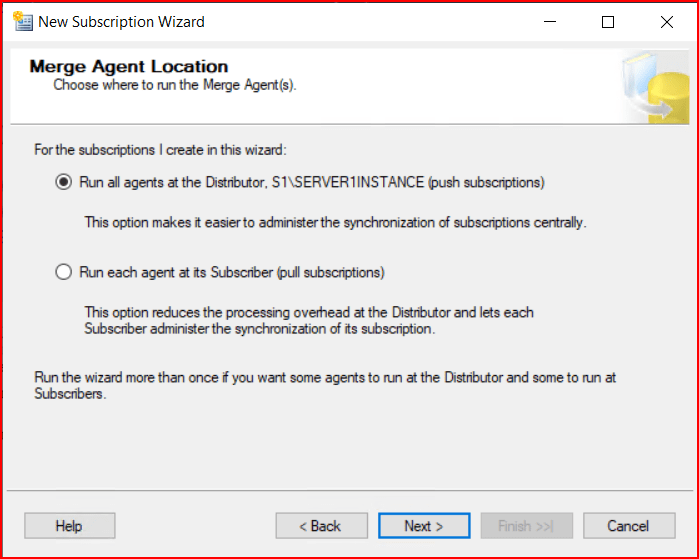 Genel kullanım senaryolarının %90’ında ilk seçenek olan “Run all agents at the Distributor” (Push Subscription) tercih edilir. Detaylandıralım: