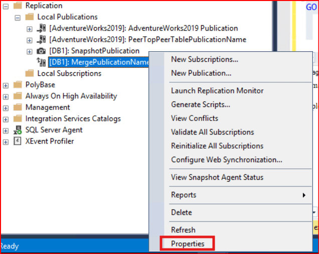 Set edeceğiniz kullanıcıyı PAL’a üye yapmak için Publisher’ın olduğu instance’ta publication’a gelip sağ tıklayarak properties diyoruz.