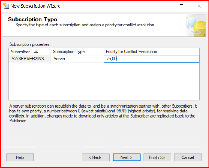 Server: Farklı Subscriber’ların farklı önceliği olmasını istiyorsanız Server seçebilirsiniz. Örneğin ben 2.sunucu için Subscription Type’ı aşağıdaki gibi Server seçmişim ve Priority for Conflict Resolution(conflict oluştuğundaki öncelik yüzdesi) olarak ta 75.00 set ettim. Üçüncü bir sunucuya başka bir subscriber oluşturduğumuzu varsayalım ve subscription type olarak yine server seçelim. Priority for Conflict Resolution’ı da 60.00 set edelim. İkinci sunucudaki subscriber ve üçüncü sunucudaki subscriber bir conflict yaşadığında ikinci sunucunun önceliği daha yüksek olduğu için ikinci sunucudaki subscriber’ın yaptığı işlem geçerli olacak. Veriyi diğer subscriber’lara yeniden yayınlayabilir.