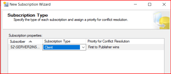 Client: Conflict dedection(subscriber’lar arasında aynı veriyi update etmeye çalışma sonucu çakışma) bu subscribtion type’da da var fakat Server subscription type’ında ki gibi subscriber’lara öncelik veremiyorsunuz. Default olarak priority 0.00 olarak geliyor. Bütün subscriber’ların aynı önceliğe sahip olmasını istiyorsanız ve publish’in yapıldığı 1.instance’ın conflict durumunda her zaman kazandığı bir senaryo istiyorsanız set edebilirsiniz. Bir çok senaryoda Client kullanılabilir.