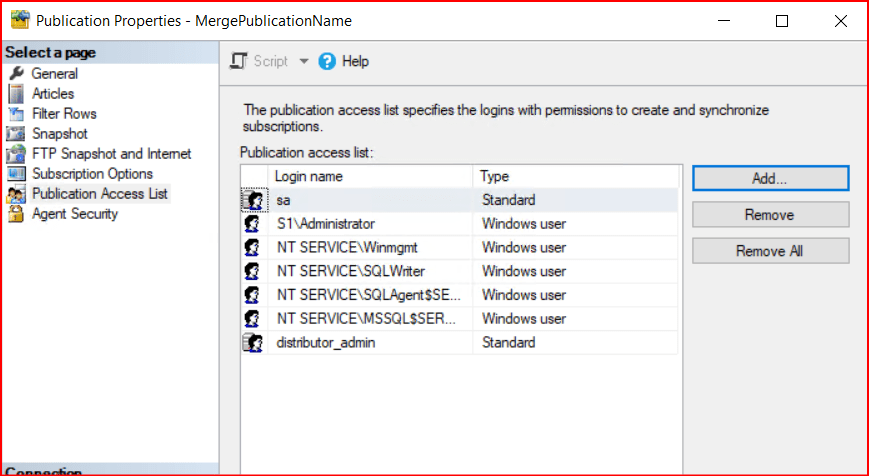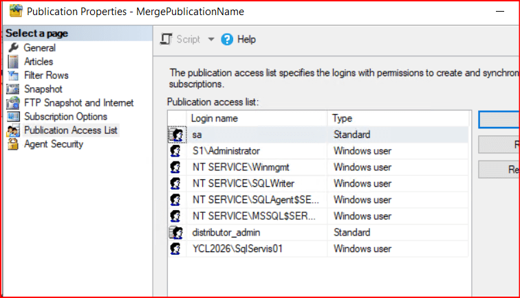 Açılan ekranda aşağıdaki gibi Publication Access List’e giderek listelenen kullanıcılar arasında kendi kullanıcımızın olup olmadığına bakıyoruz.