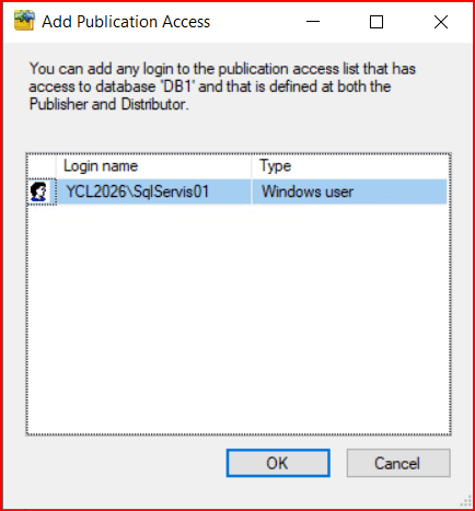 Uyarıda, kullanıcının burada listelenmesi için Publisher ve Distributor instance’ında tanımlı olmasına ve replike edeceğimiz DB1 veritabanına erişiminin olması gerektiğini söylüyor. Eğer kullanıcınız burada yoksa publisher ve distributor’un olduğu instance üzerinde kullanıcınızı tanımlayıp DB1 üzerinde de yetkilendirmeniz gerekir.