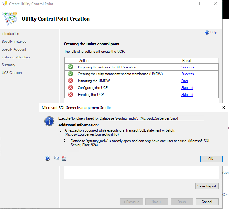 Bu hata, kurulumun oluşturmaya çalıştığı sysutility_mdw veritabanının o anda SINGLE_USER modunda olduğunu ve başka bir işlemin (muhtemelen sizin o anki bağlantınızın veya arkada çalışan bir servisin) bu veritabanını meşgul ettiğini gösterir.