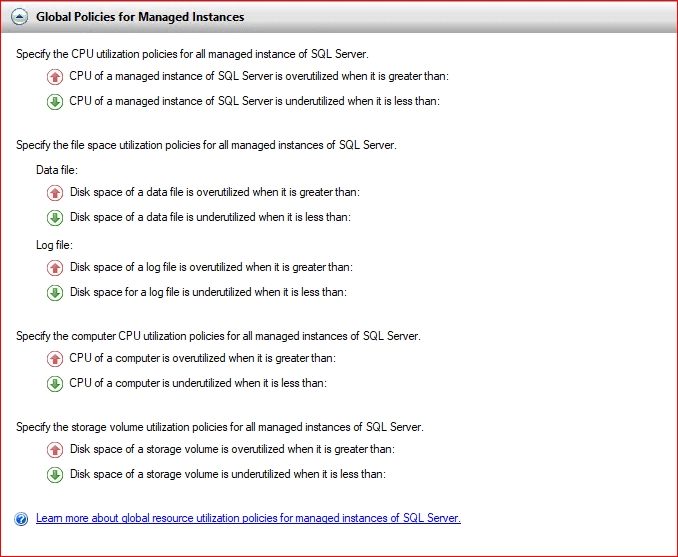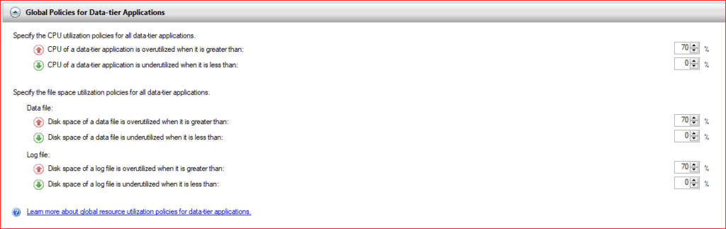 SQL Server Utility içerisinde Data-tier Applications (DAC), yani veritabanı uygulamalarınız için Global Sağlık Politikalarını belirlediğiniz bölümdür. Bu ayarlar, Utility Explorer dashboard’unda sunucularınızın veya uygulamalarınızın “Sağlıklı” (Yeşil tik) veya “Kritik/Aşırı Kullanım” (Kırmızı ünlem) olarak görünmesini sağlar.